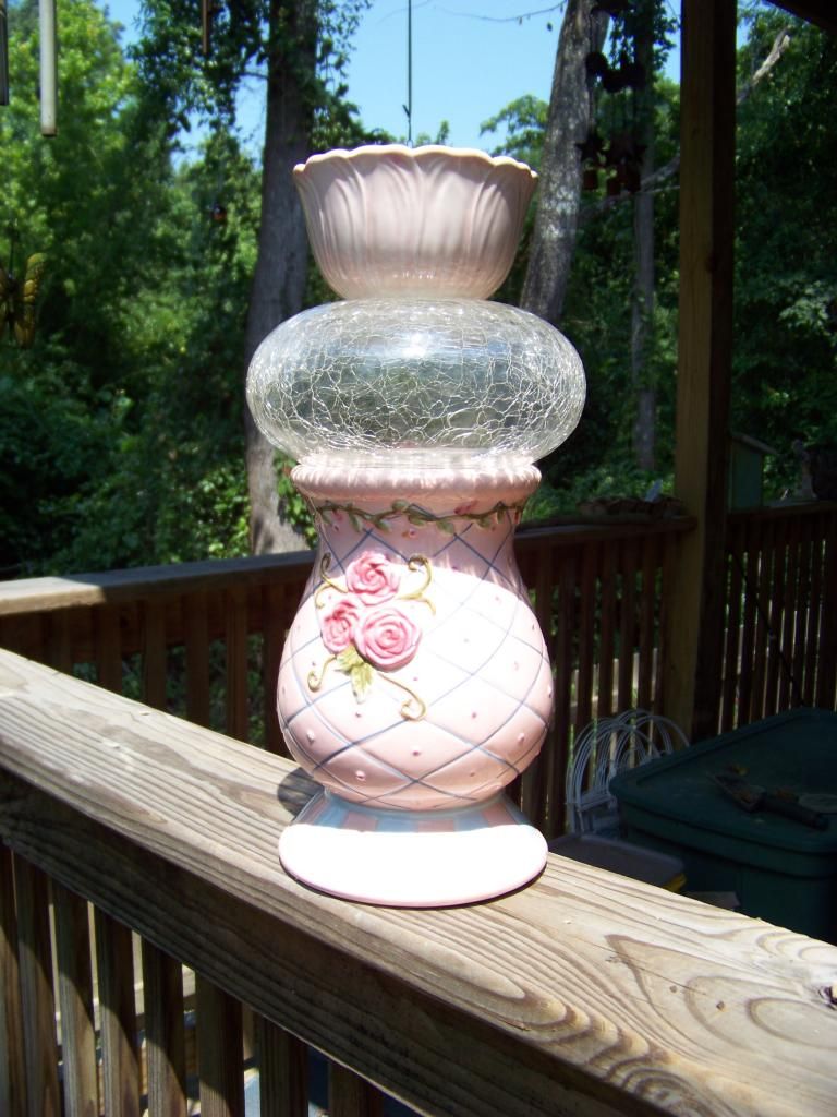 I am continuing with my crafting and hope to have enough things to sell at a little craft event held in my home town each Oct. A friend who sews really cute things and I are going to have a booth. I've posted some pics of some yard art I am learning to do and one of a ceramic piece I painted years ago. The yard art is made from old pieces of glassware found in thrift stores, yard sales, and flea markets. The first pieces I am making are for Squirt's flower garden. There is a bird bath and bird feeder shown in the pics. They aren't glued together yet but I have decide these are what I want in her garden. I plan to make at least one more for her garden that will incorporate a tea pot and be more whimsical looking - hopefully. Here are the links to the pics -